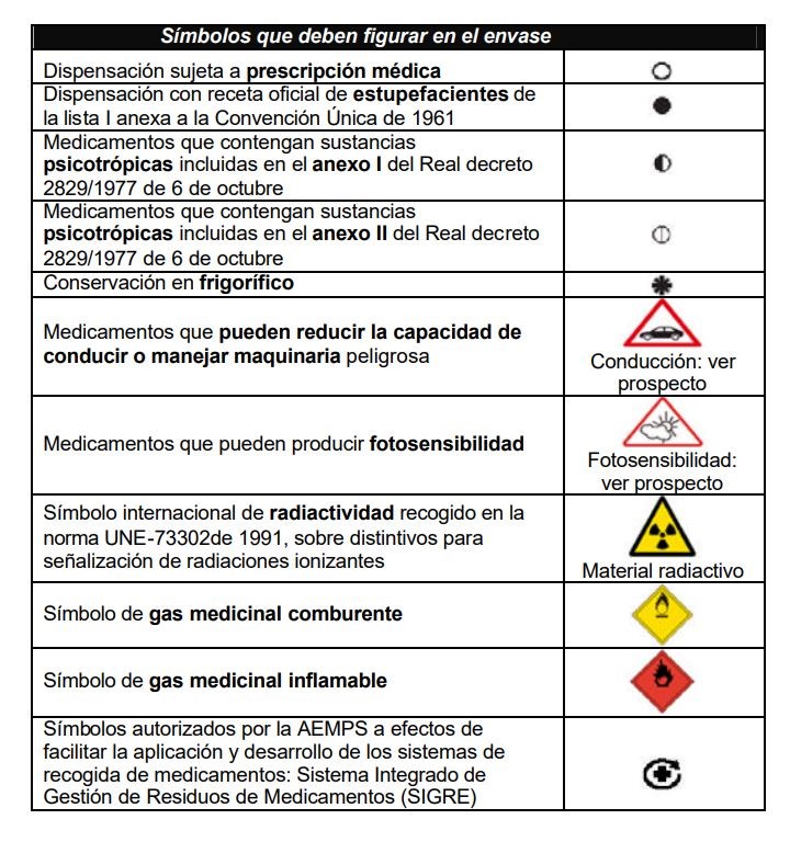 Además de los diferentes símbolos presentados en la tabla anterior, los envases de los medicamentos incluyen determinadas siglas, relacionadas con el tipo de fármaco que comercializan.