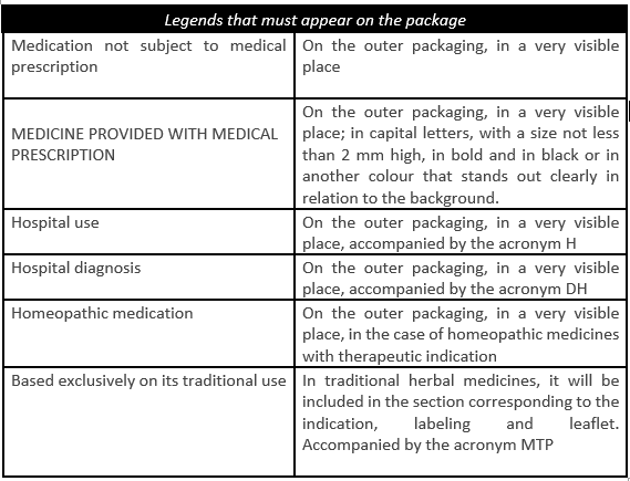 Apart from the symbols and acronyms, pharmaceutical packages include captions with different indications of mandatory use: