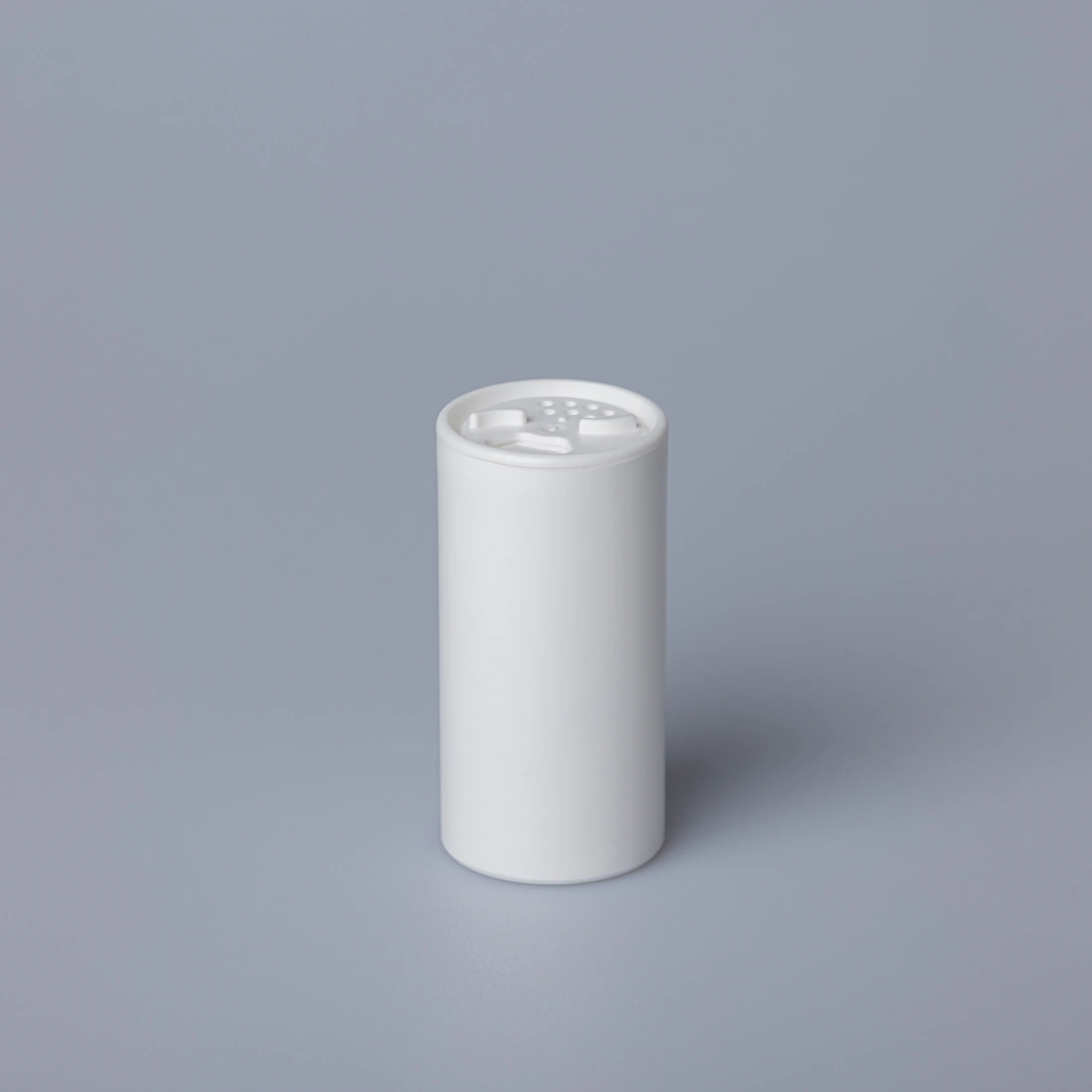 Small spice shaker, ideal for packaging salt and spices in small quantities. It has an internal diameter of 37.90 mm, a height of 78.10 mm and a total capacity of 76 ml, which allows packaging approximately 75 g of common salt. Its compact design makes it suitable for both domestic use and for small-format packaging lines.